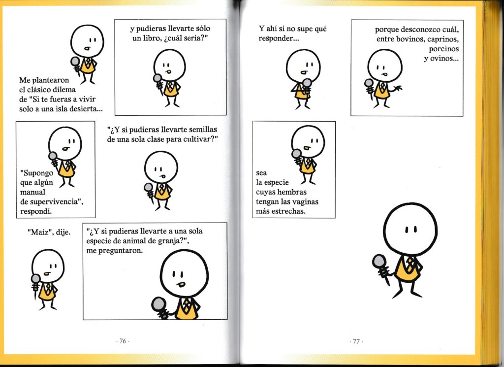 El contenido: El libro es exactamente lo que se ha descrito: No hay trama ni crisis. El personaje presenta su stand up, cambiando de temas sin transiciones, usando pausas que sirven para esperar reacciones del público, o en este caso del lector.