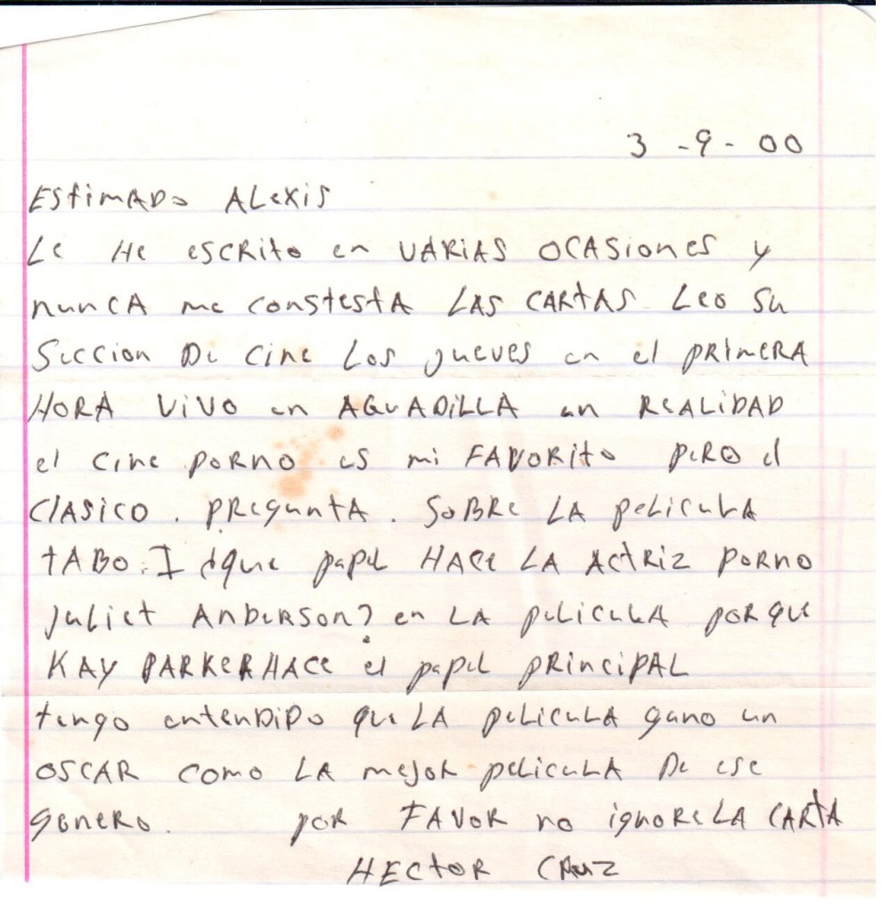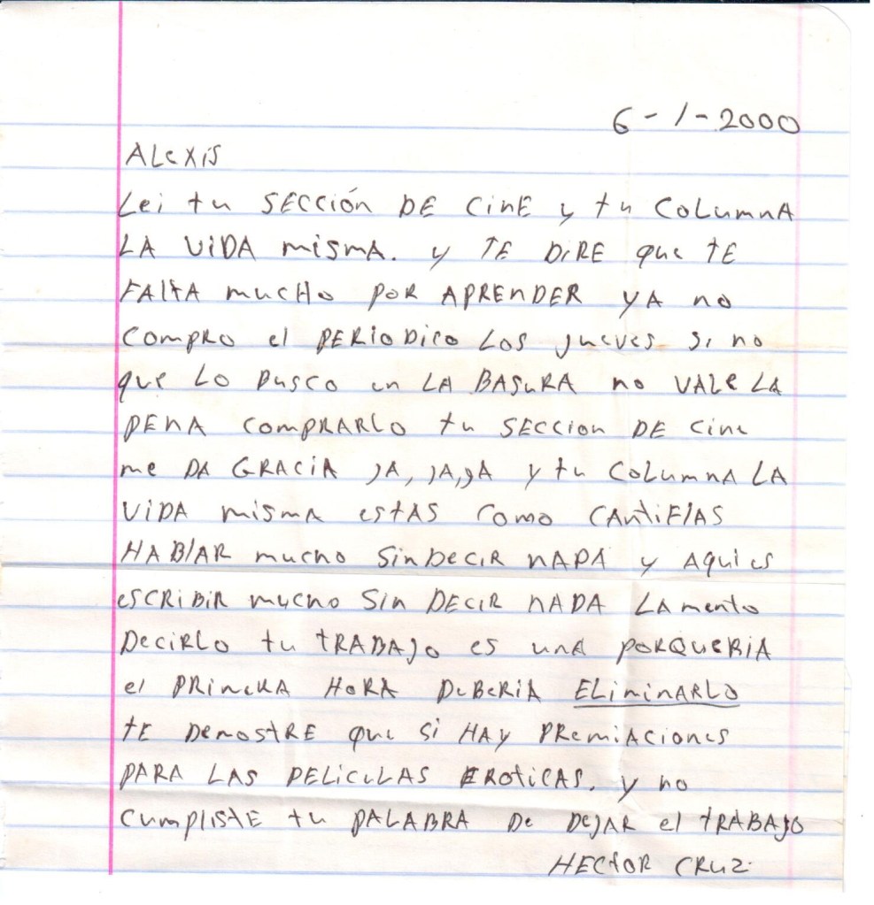 “De paso, aprovecho para extender la sugerencia a Héctor Cruz, a quien en la misma fecha contesté su misiva sobre películas pornográficas. Parece no haber comprado el ejemplar, pues volvió a escribirme pidiendo respuesta. No me molesta que me escriba, pues así ocupa sus manos en otros menesteres”.