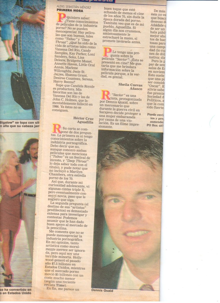 “Quisiera saber: ¿Tiene conocimientos de la industria porno? No se pueden menospreciar. Hay películas que son buenas, tales como “Taboo” y “Deep Throat”. ¿Qué ha sido de la vida de artistas tales como Vanessa Del Río, Candy Samples, Kay Parker, Loni Sanders, Seka, Lisa Deleew, Bridget Monet, Annette Haven, Little Oral Annie, Marlene Willoughby, Jasie St. James, Shanna Grant, Desiree Couesteau, Serena, Harry Seems?