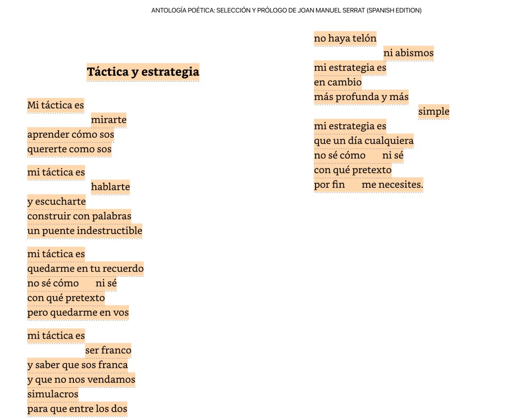 En resumen: Colección de poemas del escritor uruguayo Mario Benedetti, en celebración al centenario de su nacimiento. La selección de poemas, así como la introducción, quedó en manos del cantautor Joan Manuel Serrat.