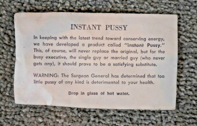 El cartón incluía un papel, el cual he podido conseguir gracias a la magia del Internet (el producto ya no se fabrica). El papel establecía: “En tono con las tendencias recientes a la conservación de energía, hemos desarrollado un producto llamado “Instant Pussy”. Esto, por supuesto, nunca podrá reemplazar el original, pero para el ejecutivo ocupado, el hombre soltero o el hombre casado (que nunca lo tiene), debe probar ser un sustituto satisfactorio. Advertencia: El Cirujano General ha determinado que muy poco “pussy” puede ser perjudicial para su salud”.