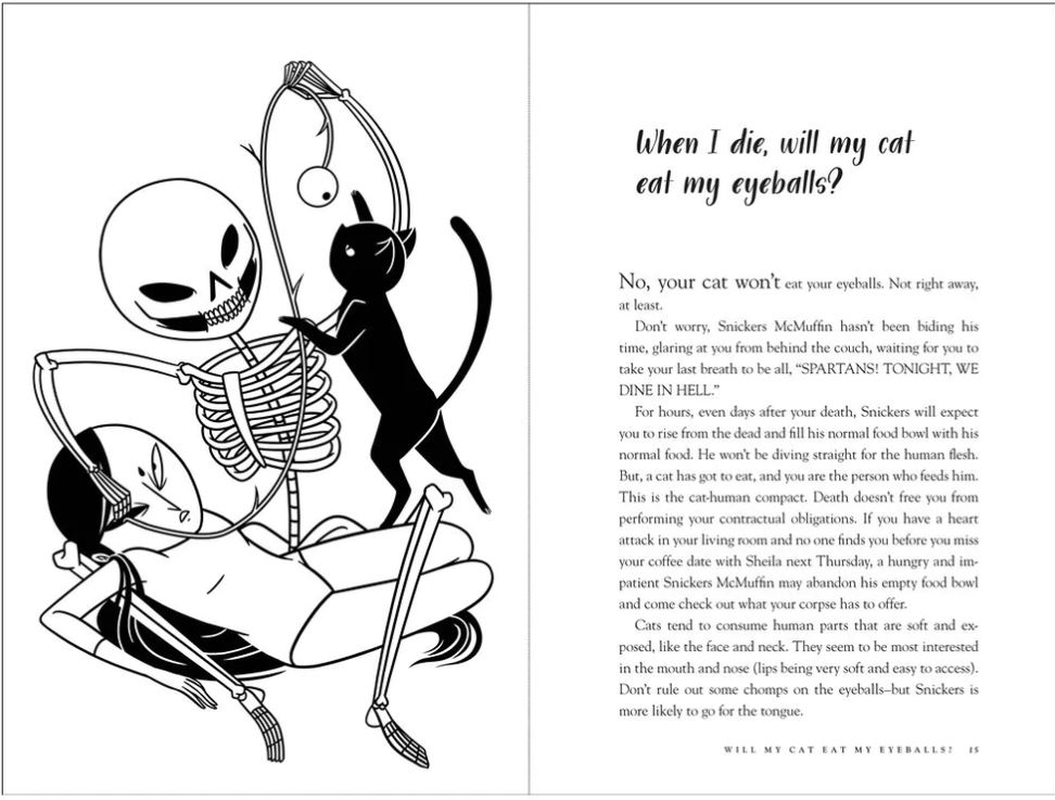 El contenido: El libro incluye sobre 25 preguntas, todas contestadas con extensión entre 3 a 5 páginas. Cada pregunta incluye una ilustración tétrica infantilizada. También se incluye una conversación con un psicóloga sobre cómo los niños entienden la muerte, y algunas preguntas con respuestas cortas que no ameritaban su propio capítulo.
