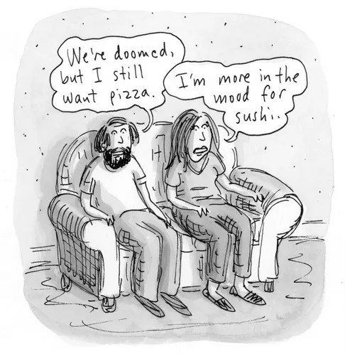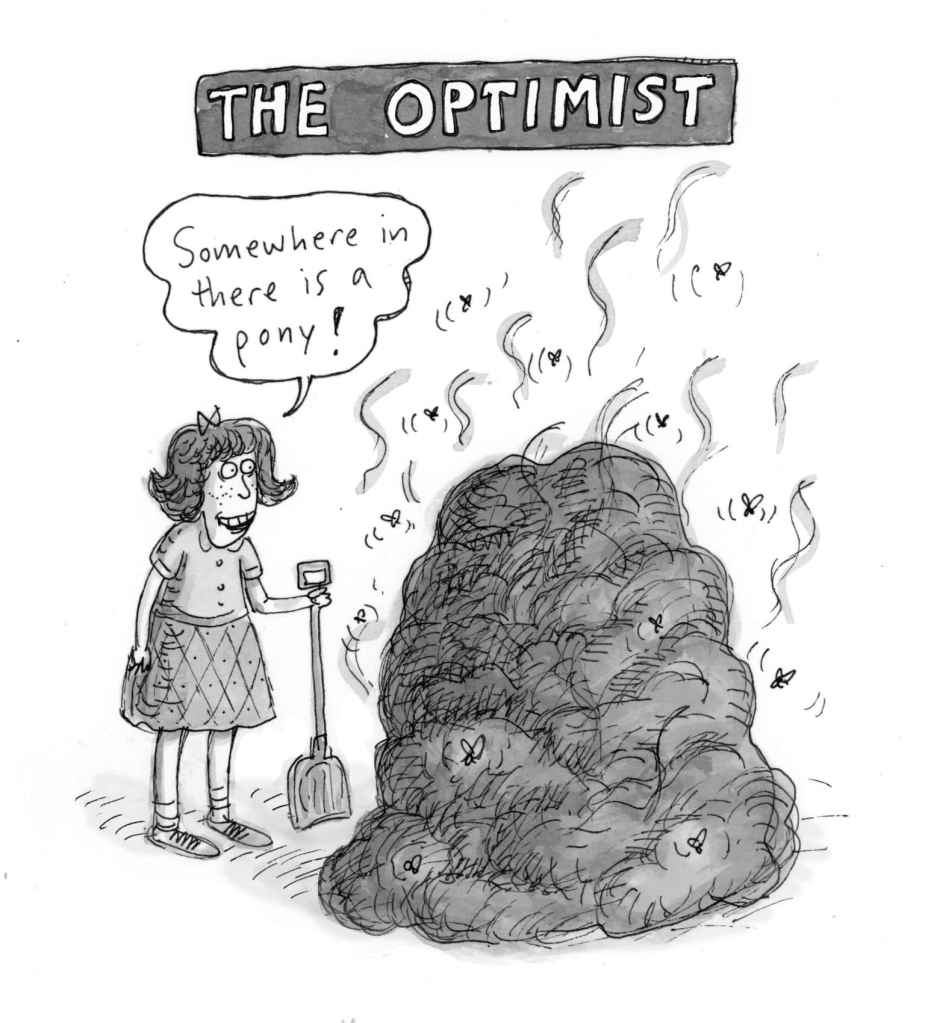 Por ejemplo, encontré divertida la actitud sarcástica contra consejos que ya son cliché (“Vive cada día como el último”; “Puedes lograr lo que te propongas”, “Encuentra el bien en ca persona”, “No juzgues muy rápido”). También presenta una visión sobre la felicidad: No puede ser una meta, ya que la felicidad, por diseño, consta de momentos pasajeros.