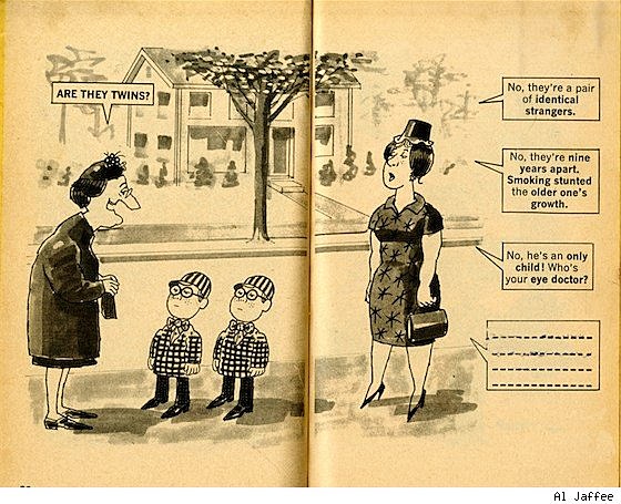 En resumen: Tirillas de “Mad” creadas especialmente para formato de “pocketbook”, hago que la revista cultivó durante muchos años. Las mismas son del segmento “Snappy Answers to Stupid Questions”, creado por el genial Al Jaffee, que consistía en respuestas sarcásticas y burlonas contra preguntas estúpidas o innecesarias.