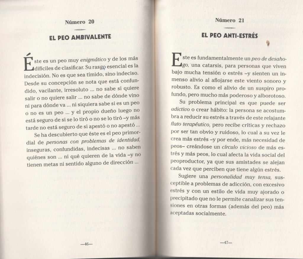 Este trato es el que recibe el peo en este libro. Por tanto, tenemos una sátira mordaz contra profesionales de la psicología, y los interesas banales de las masas. En términos más livianos y accesibles, se trata de un libro que puede disfrutar leyendo segmentos en su oficina o entre sus amigos y, claro, le sirve para determinar la personalidad de sus compañeros, según sus peos.