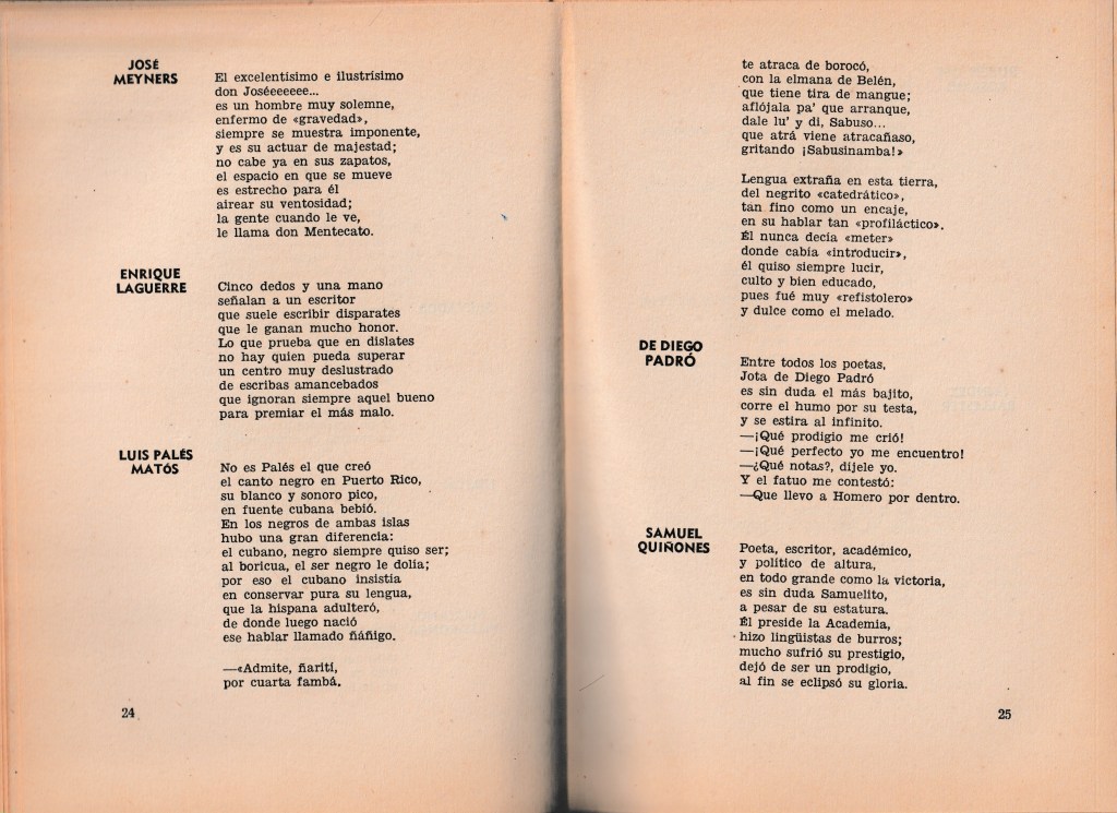En ocasiones el autor recurre al verso para algunas descargas. Uno de sus blancos constantes, es la presidenta del Ateneo Puertorriqueño en aquellos momentos. Veamos: