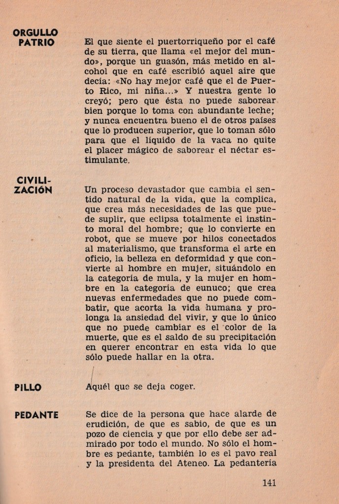 El contenido: Ignacio Guasp ofrece cientos de definiciones que van desde pocas palabras hasta algunas páginas. El diccionario, contrario a otros libros de referencia, no sigue orden alfabético, y las palabras se agrupan en capítulos de manera caprichosa porque, según el autor, “porque en Puerto Rico las letras no tienen orden alguno”.