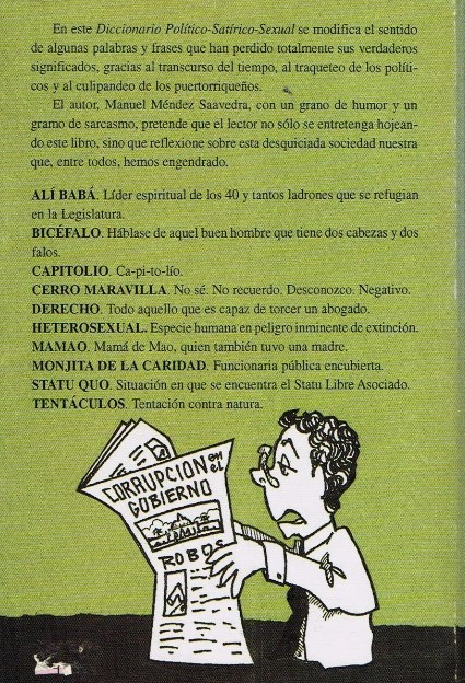 El contenido: El título ya indica de lo que trata: definiciones satíricas en relación a temas políticos y sexuales (supongo que la relación es que son los dos temas predilectos del boricua).