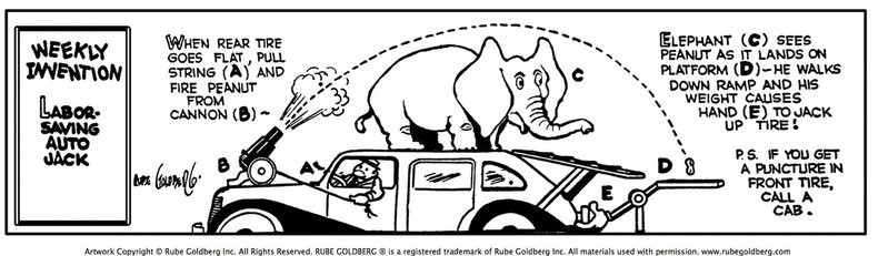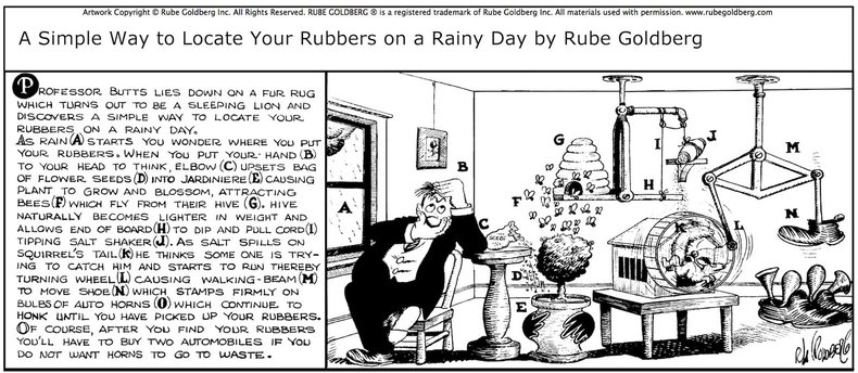 El contenido: El libro contiene sobre un centenar de estas invenciones. Más que pretender explicarlas, es mejor ver algunos de los ejemplos que comparto. Ahí se puede apreciar lo complicado que resulta el invento, que en ocasiones requiere animales, enanos, y distancias muy especificas al momento de utilizarse. Goldberg estaba parodiando los constantes avances en tecnología y diseño, para dificultades que no merecían atención.