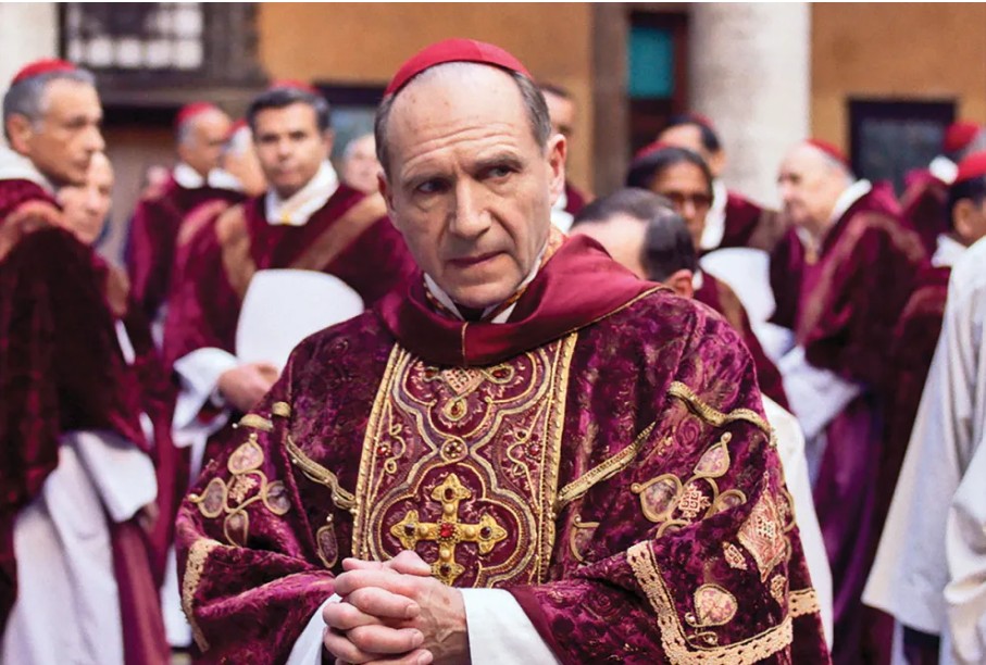 No he dicho mucho de la película, pero así lo resumiría sin arruinarles las sorpresas: Ralph Fiennes dirige el conclave que se elegirá el nuevo Papa. Hay una serie de fuertes candidatos (en un filme de misterio, diríamos que sospechosos del crimen), pero según avanza la acción, algunos son eliminados del proceso (similar a cuando en un filme de detective, te matan a uno de los sospechosos). En el camino, hay reflexiones sobre la dualidad moral de la religión.