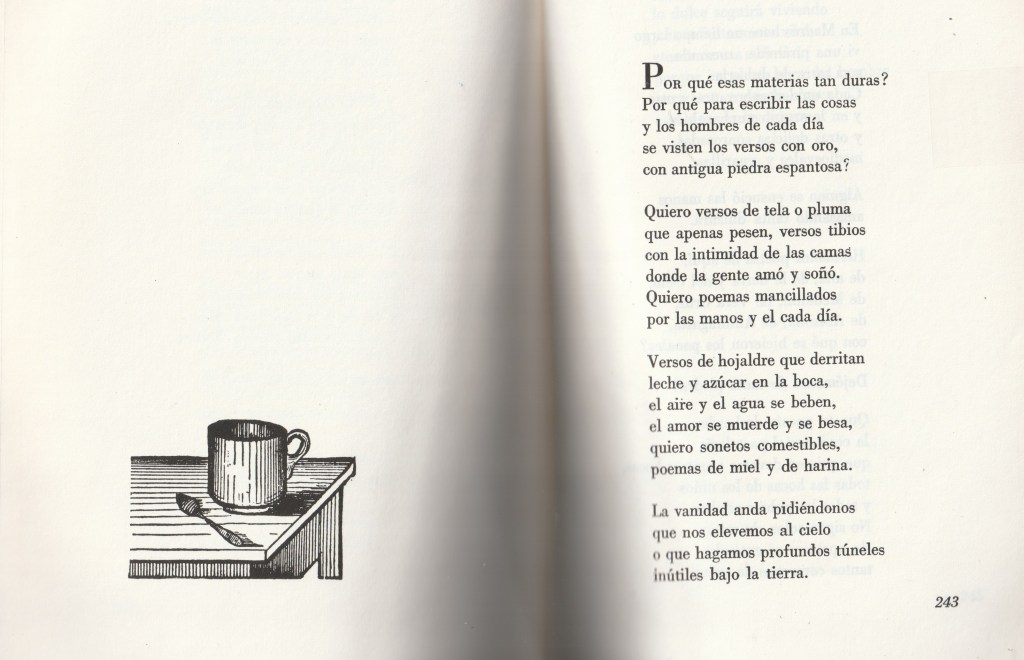 El contenido: No conocía de este poemario, el cual encontré curioso y hasta inesperadamente divertido en ocasiones. Después de terminarlo fue que busqué información al respecto, y es reconocido como una obra importante de Neruda, por la manera en que rompe con sus temas y estilos habituales.
