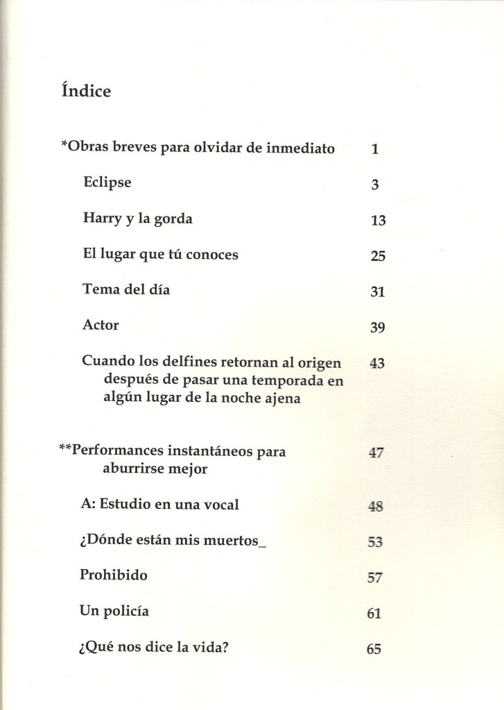 El mismo principio literario lo aplica a su “teatro desechable”: La mayoría requieren (como máximo) para presentase de dos actores y una silla. Son escenas de unas cinco páginas, que algunos clasificarían de irreverentes (hay algo de eso también) pero en realidad pertenecen al teatro del absurdo, donde la aparente falta de lógica no busca más que reflejar el absurdo (solo soy redundante para que entendamos el nombre del género) de la vida, los humanos y la sociedad.
